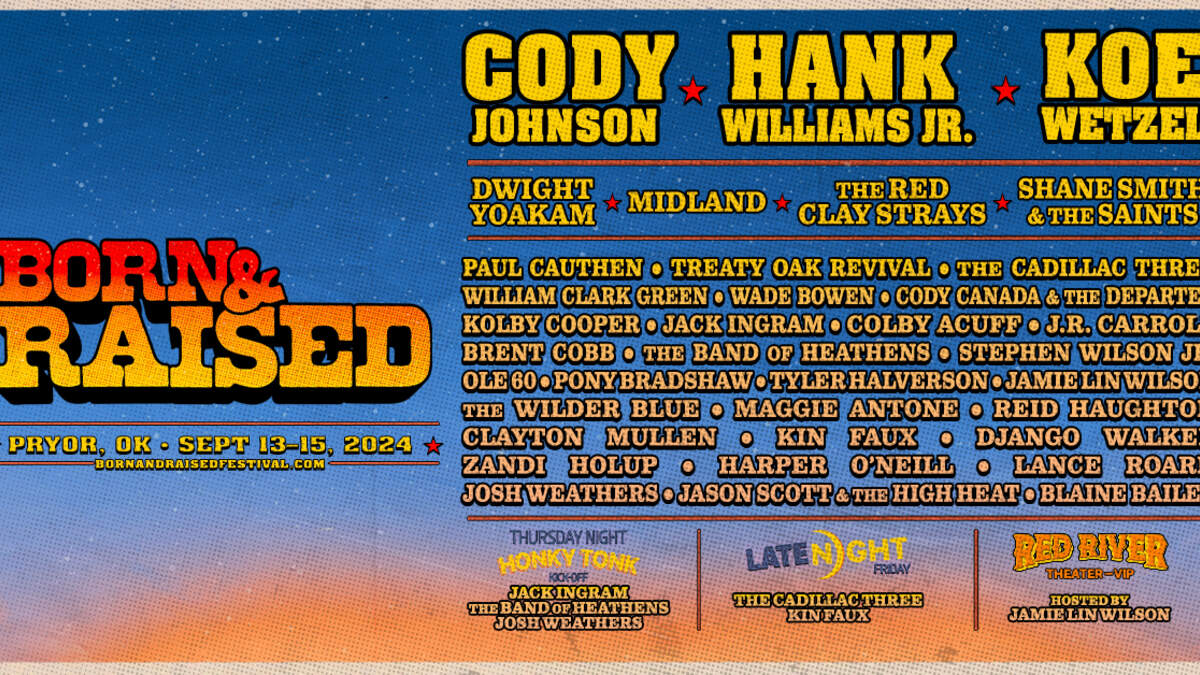 We are proud to announce the 2024 lineup for the 4th annual Born & Raised Festival happening September 13-15 in Pryor, OK! The lineup, programmed specifically For The Outlaw In All Of Us, features headliners Cody Johnson, Hank Williams Jr., and Koe Wetzel on the mainstage alongside the very best of left-of-center country artists and bands who comfortably walk the line between Outlaw, Americana, Red Dirt, and Folk genres.